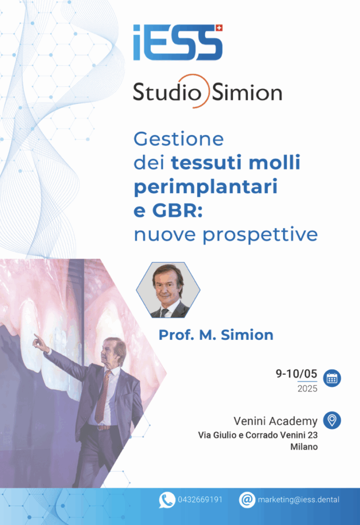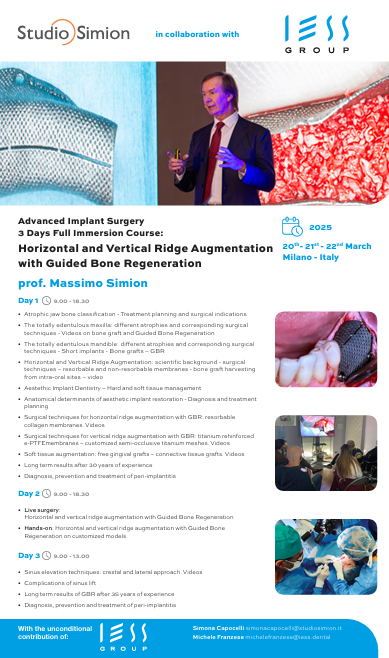 Three days of full immersion with Prof. Massimo Simion with interactive lectures about the most recent techniques for bone regeneration and soft tissue management around dental implants, comprehending a Live Surgery and an Hands-on.
